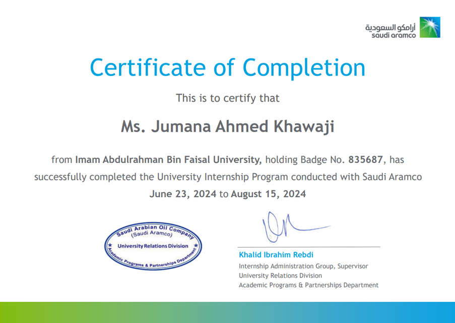 Jumana Ahmed Khawaji, located in Dammam city, . With expertise in full-stack development and machine learning, I strive to excel in full-stack development to build innovative and effective applications that solve real-world problems.